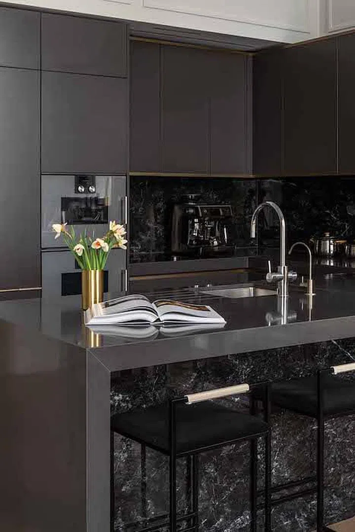 In contrast to the cream palette running throughout the rest of the home, the kitchen features dark hues with the cabinetry and countertops in matte black.