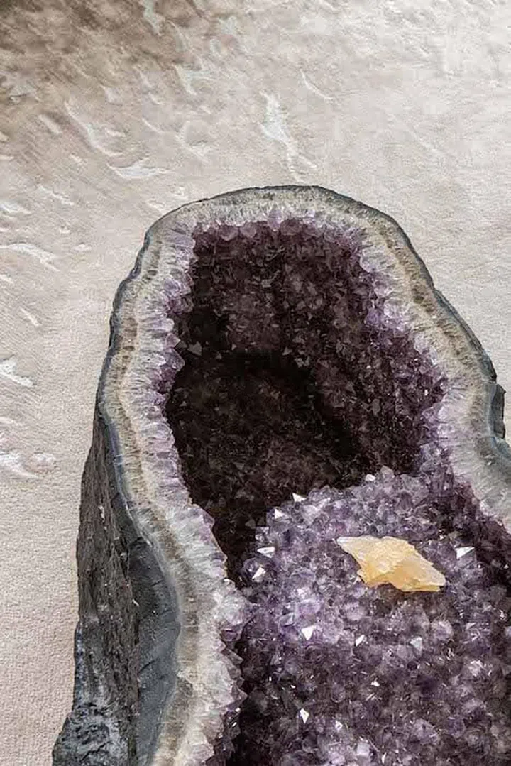 The coffee table is actually a crystal geode filled with quartz crystals. These agate tables, which had to be tracked a long time and then transported from America, were to become a key element.