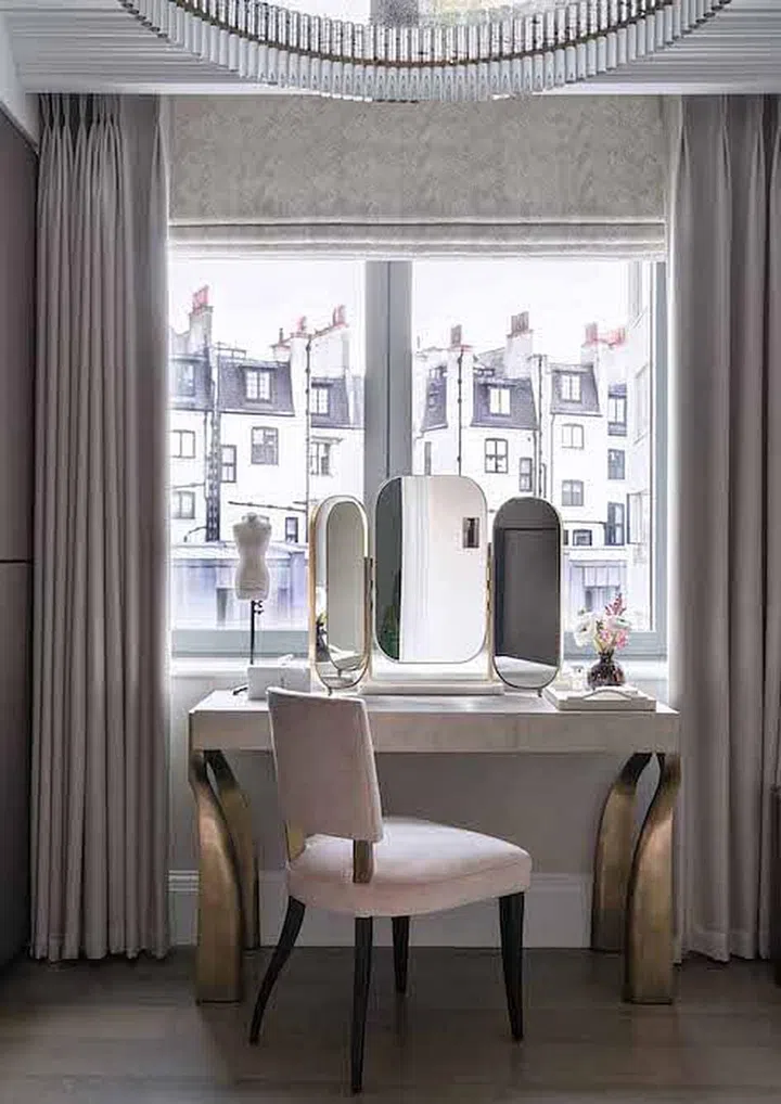 The dressing table sits by the window in the master bedroom, looking out into the picturesque view of central London.