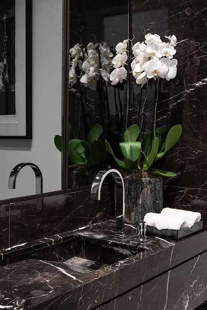 The black marble countertop in the bathroom pairs beautifully with the white walls.