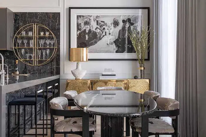 The dining table was designed by Carlo Scarpa; chairs, Gallotti & Radice, in fabric from Dedar; bar stools, by Crea; table lamps designed by Kelly Weirstler for Visual Comfort & Co.; vases designed by Jean-Louis Deniot for Baker.