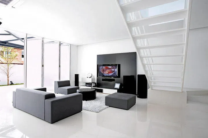 The use of blocky furniture echoes the home’s sleek, architectural lines, and its dark grey hue juxtaposes with the all-white space to create a balanced colour scheme. This minimalist aesthetic is a hallmark of the open-concept design, allowing the focus to remain on the home’s clean lines and natural materials. The angular shapes of the furniture also complement the angular architecture of the 3-storey house, creating a harmonious visual flow throughout the interior.