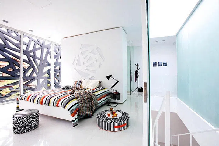 Ascending to the upper floor, the master bedroom of this 3-storey house is cosied up thanks to the vibrant bed linen and matching pouffes. Here, the designers have introduced a pop of color and texture to offset the minimalist palette, creating a cozy and inviting retreat. The home’s exterior and interior spaces also flow seamlessly into each other with the help of full-height windows that allow the homeowners to admire the distinctive facade from inside as well.