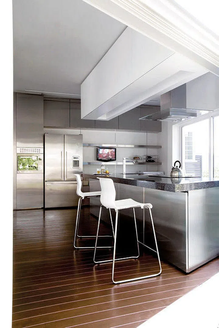 While the kitchen is decked out in wood and steel, the white theme is still subtley carried through with the white bar-height chairs. This helps to maintain visual cohesion throughout the open-concept home, ensuring that each room seamlessly transitions into the next. The combination of natural materials and monochromatic tones creates a sense of serenity and sophistication, making the kitchen a true centerpiece of the living space.