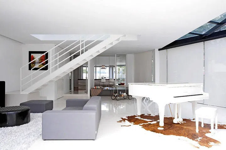 Stepping inside, the ground floor of this open-concept home is maximised with an expansive open-concept design. The crisp white surfaces of the walls and staircase also helps this already light-filled area to be brightened up further, creating a sense of airiness and spaciousness. Zoning is also important in large open spaces, and the homeowners did this cleverly with textural floor rugs to delineate different living zones within the open-concept layout. The rugs not only define the various areas but also add warmth and visual interest to the minimalist palette.