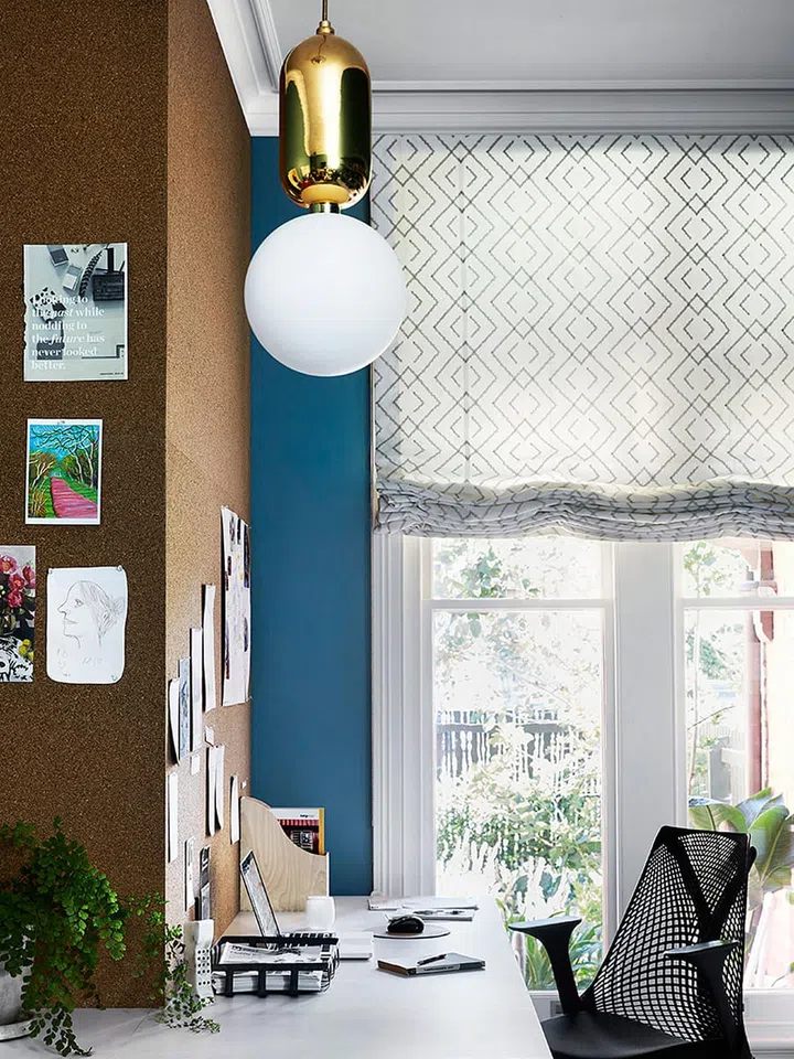 The designers chose a more vibrant shade of blue for the study. The space was enlivened with brass accents and potted plants in varying sizes.