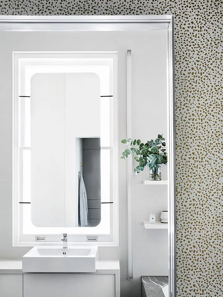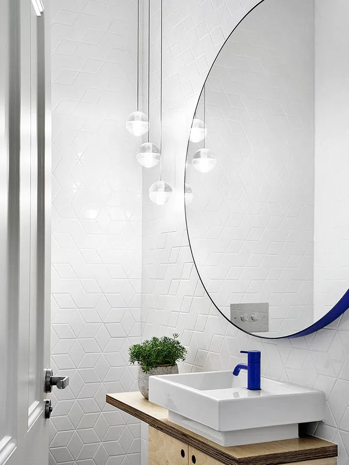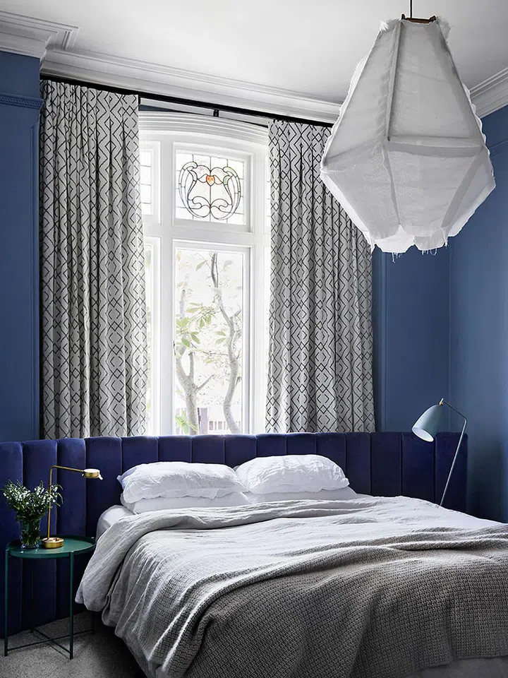 For a sense of continuity and unity throughout the rooms, use the same patterns and colours. The bathroom features a darker shade of blue as well as geometric tiles.