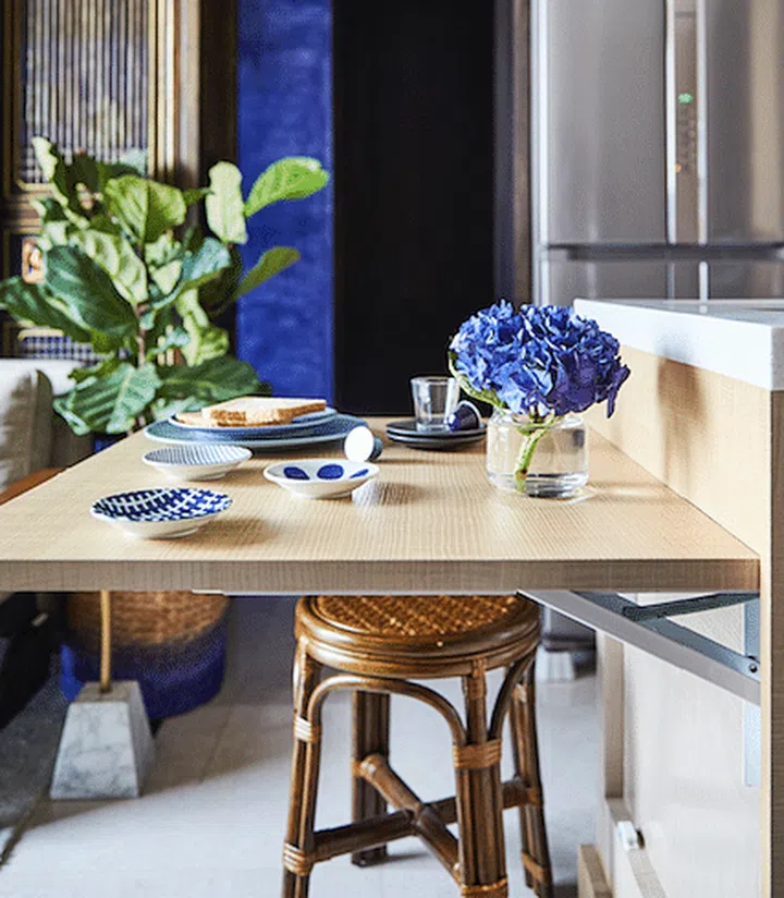 Everything has a dual function so as to make the most of a small space. The coffee table can be converted into a dining table, while the sofa serves a triple purpose, including as a dining banquette and a sofa bed.
