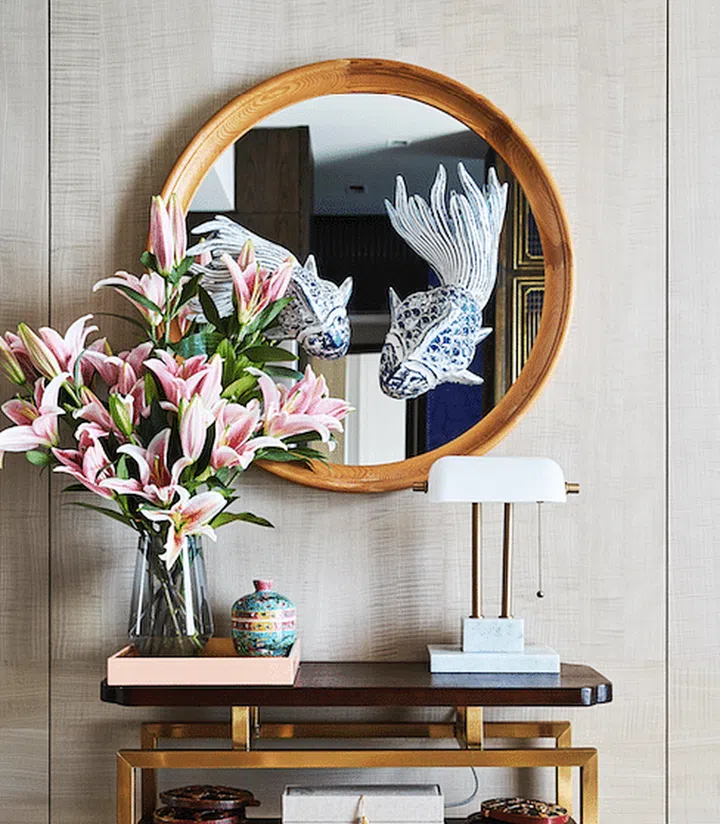 A DIY mirror feature creates an interesting visual element near the entrance foyer.