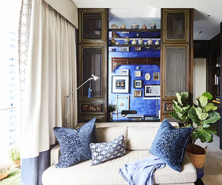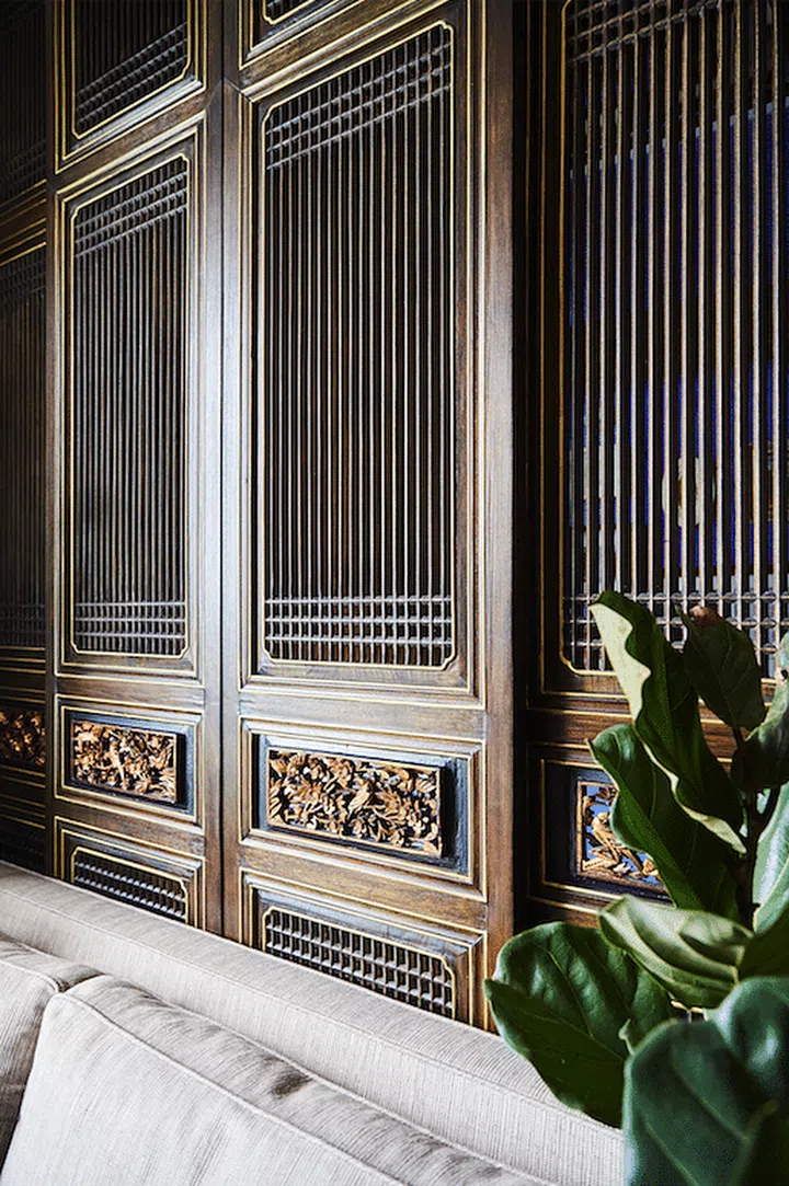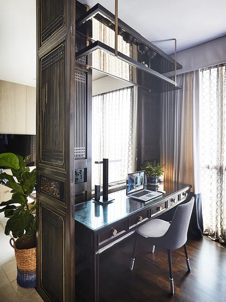 These full-height screens set the oriental tone of the apartment, and creates privacy for the study room when desired.