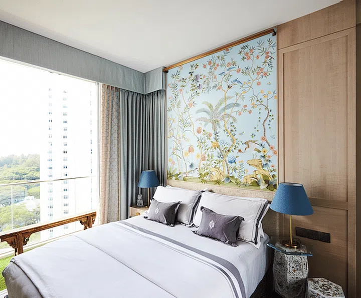 The bedroom has a pastel colour palette. Hand-painted silk wallpaper from Just Anthony, porcelain garden stools used as bedside tables and lamps from Ikea have been artfully put together to achieve a tasteful look.