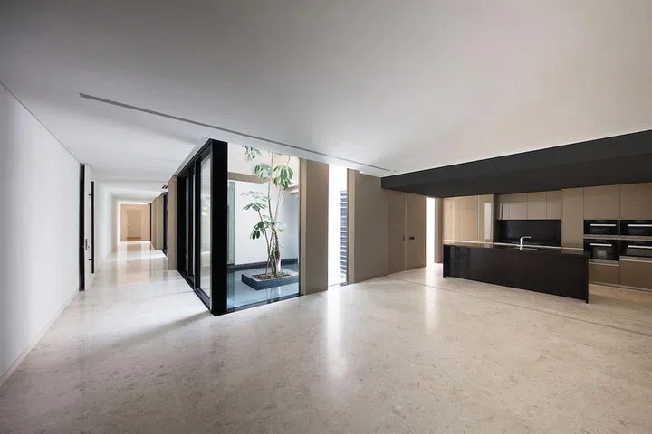 The interior also features an earth-toned and black colour scheme. Occasional accents of chocolate and taupe creates depth in this massive space. The island counter is clad in Caesarstone's Emperadoro while bedrooms are lined with white oak flooring.