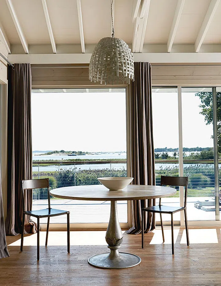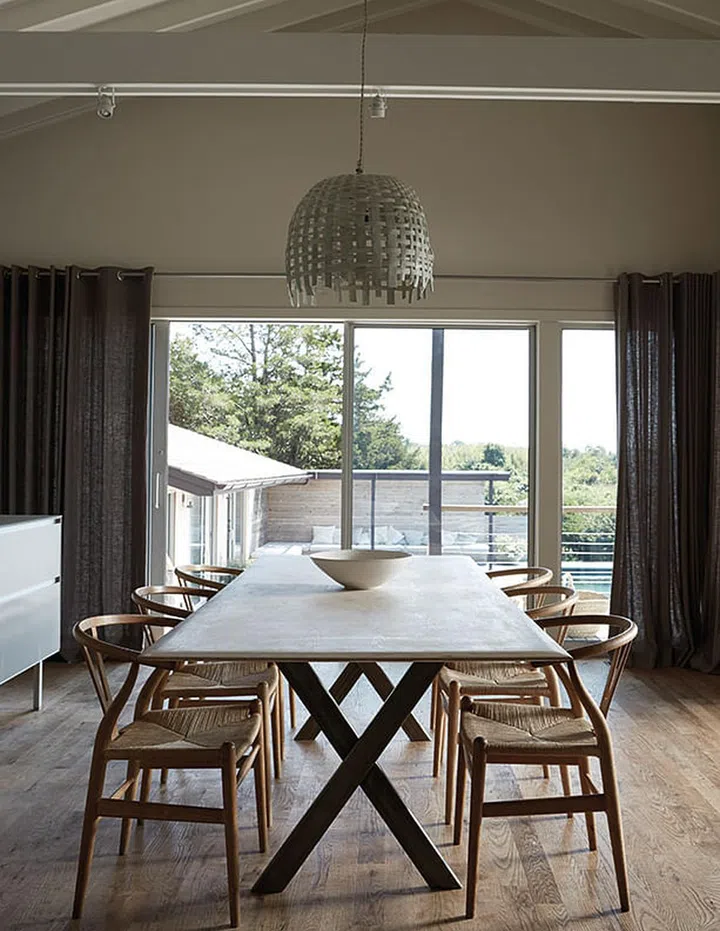 The classic lines of the Canvas Home dining table and Wegner chairs emphasise the beauty of simplicity. Dark Linenme curtains frame the wide glass doors.