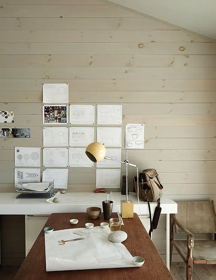 The office features some vintage finds from a flea market, including a lovely, worn chair and retro table lamp. They complement the vintage desk and washed wood walls to create a cosy work space.