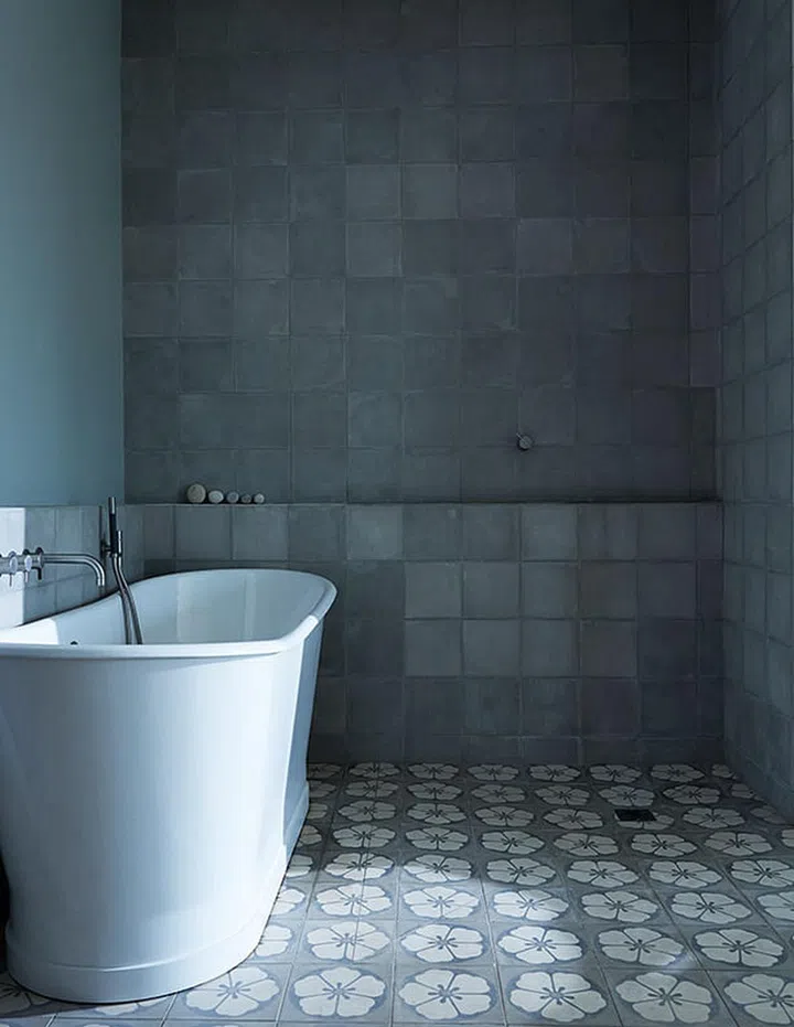 The stylish master bathroom boasts an elegant Sunrise bathtub perched on custom-made Emery & Cie floor tiles. Their floral design injects an uplifting sense into the space.