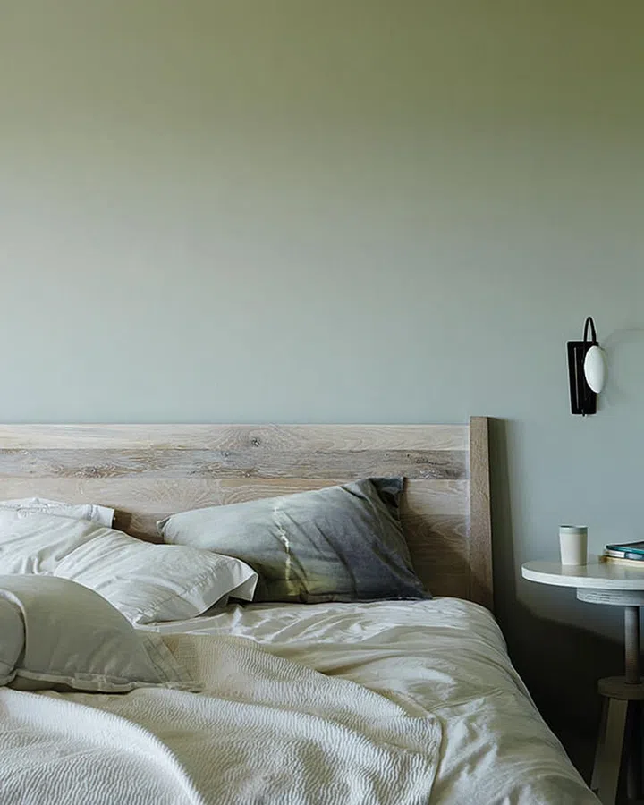The master bedroom bed by Canvas Home is flanked by an eye-catching Scorpion wall light by Ochre. Pillows are dressed up in Kirsten Hecktermann fabric.