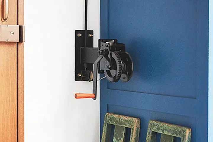 Above, a skylight with a rustic pulley-lever system adds both practical illumination and industrial charm to the space.