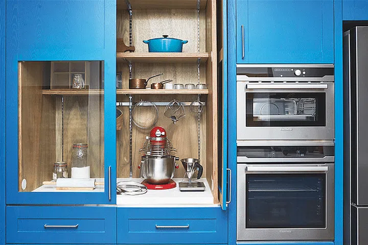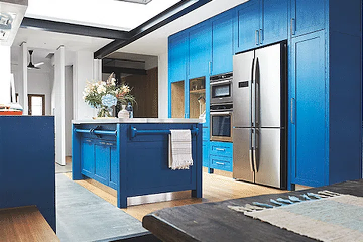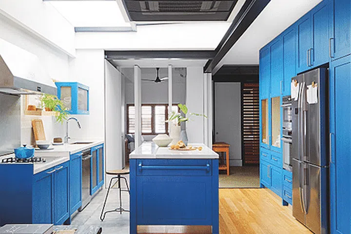 The Mediterranean-style interior design continues in the kitchen, where oak flooring extends seamlessly into the cabinetry. Here, the couple’s beloved Provençal blue makes its boldest statement, transforming practical storage into a visual reminder of Mediterranean seas and skies. “Every time I look at this blue, I’m transported to those stunning coastal towns,” Sheau-Yin shares, running her hand along the painted surfaces.