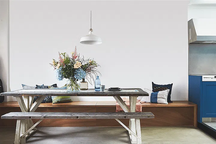 The Mediterranean-style apartment now boasts multiple built-ins that seem to have always belonged there, including a charming plywood dining bench paired with a weathered wooden picnic table that could have been plucked straight from a Tuscan farmhouse. The careful styling, featuring tableware and vases from Homes To Life and fresh blooms from Charlotte Puxley, adds those perfect finishing touches that make a house feel like home.