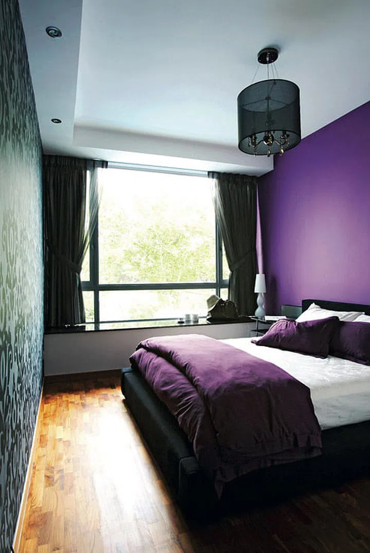 The grey wallpaper and purple wall help give the sun-drenched master bedroom a more intimate feel.