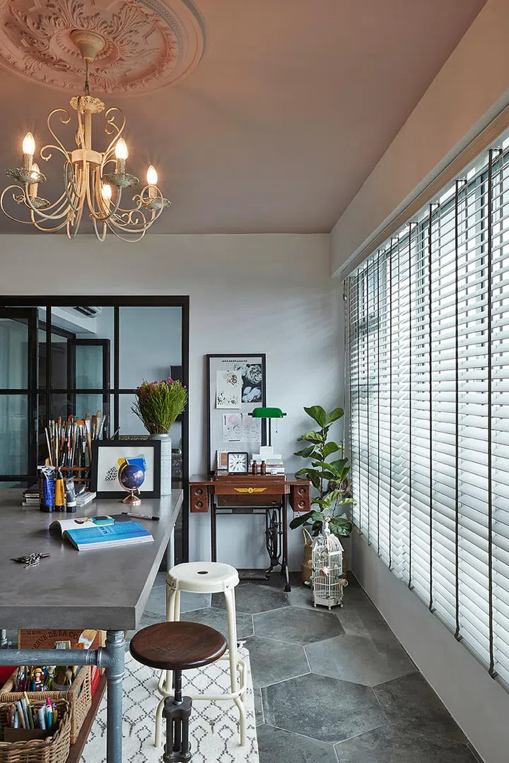 The couple also collects various interesting furniture pieces and fixtures, such as an ornate chandelier and a vintage sewing machine, which has now been repurposed into a side table.