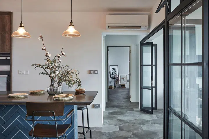 Designed by the team at Three-D Conceptwerke, a good part of the home is tiled with hexagonal grey flooring for a textural look and feel. To add a pop of colour, blue herringbone-laid tiles were chosen for the dining counter.