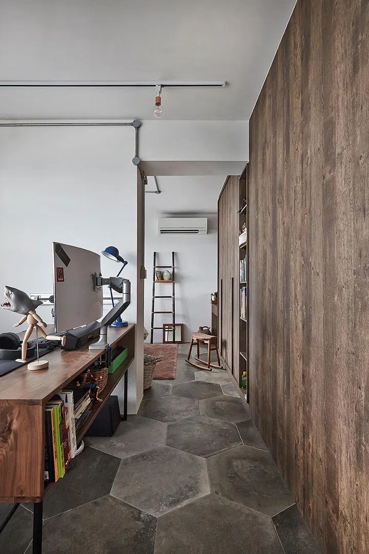 Home to a young couple, this 1,200sqf five-room HDB BTO apartment in Ang Mo Kio combines a mix of rustic and industrial-inspired elements.