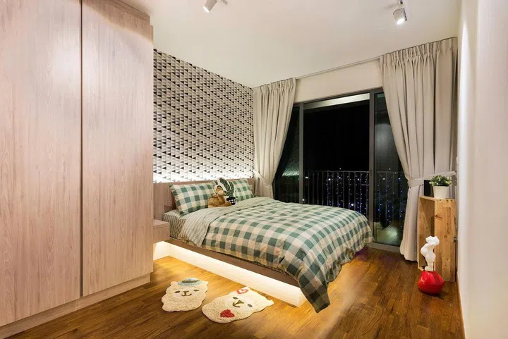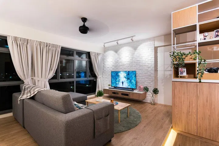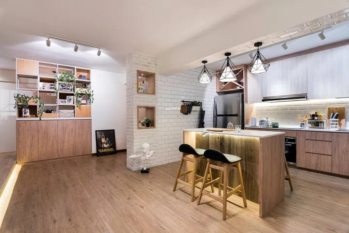 This five-room HDB BTO home was designed to look like a Scandinavian-style cafe-inspired home. The young couple engaged the help of interior design firm Fineline, who suggested a palette of white and wood-look finishes for a warm ambience yet bright interior.