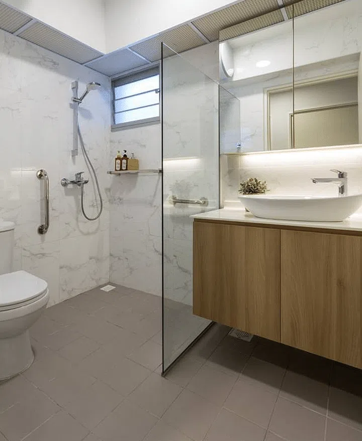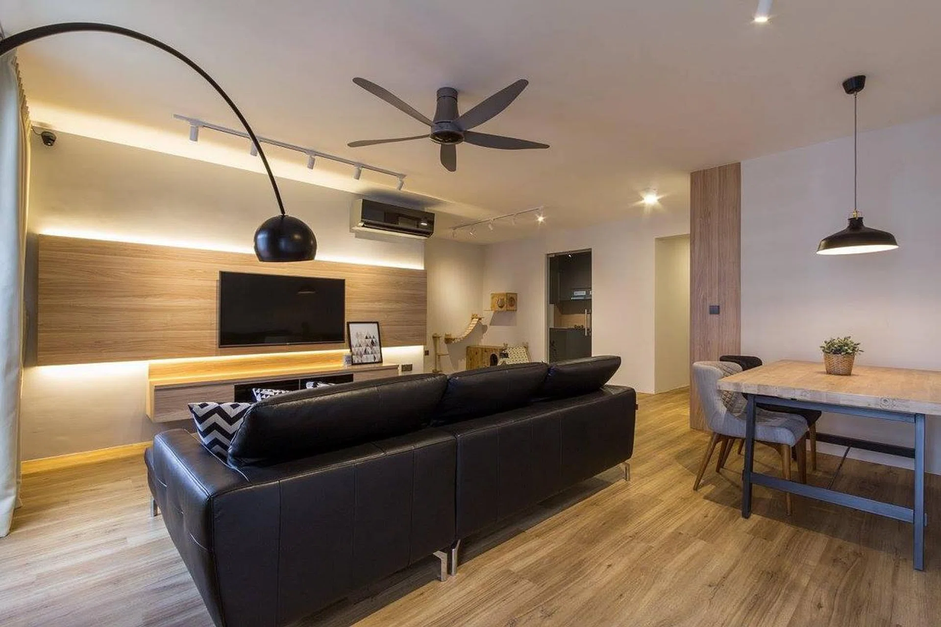 For the living room, the designers at Fineline chose wood-look flooring and customised the TV feature wall with a material of the similar shade. Backlit lights sets the ambience, and adds warmth to the cosy space.