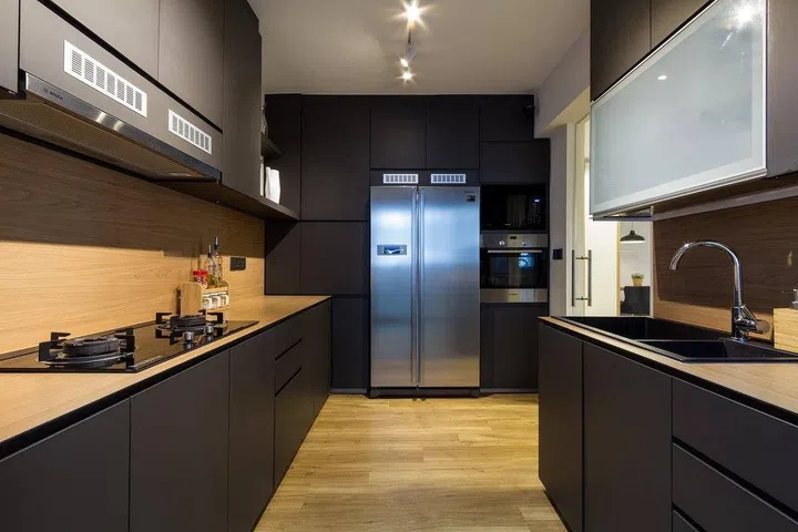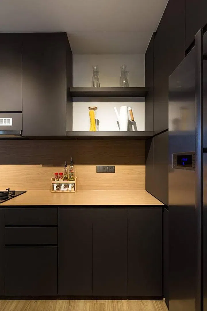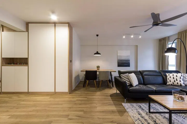 The homeowners of this four-room HDB apartment wanted a Scandinavian-inspired look, with white and wood tones as well as darker colours in specific areas of the home.