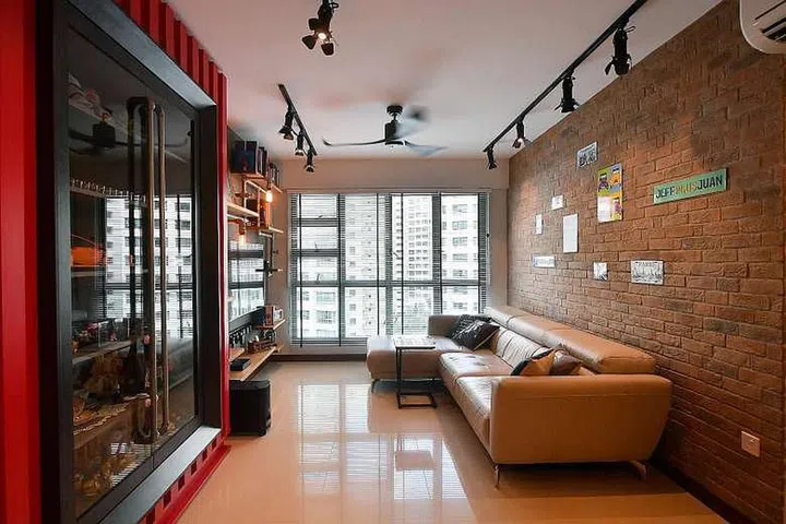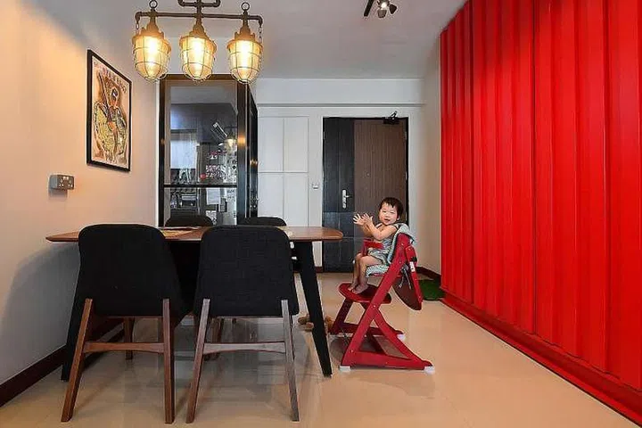 There is a red "shipping container" in the living room of this four-room Housing Board flat in Punggol.