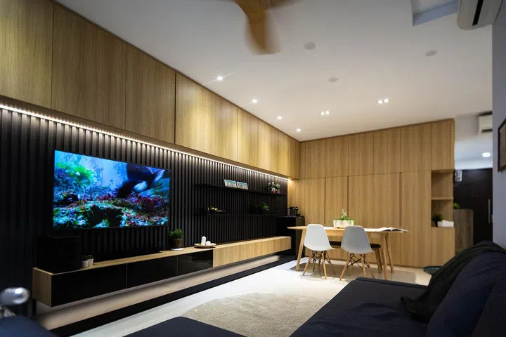 In the living room, the interior designers inversed the orientation of the space, such that the TV feature wall now occupies the long side of the room, giving the perception of greater spaciousness.