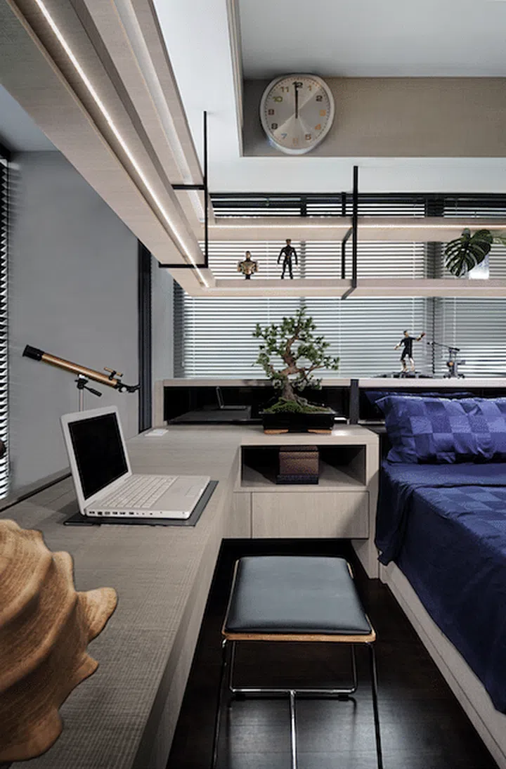 Top-hung display shelves take advantage of the ceiling space while injecting an element of interest within the bedroom.