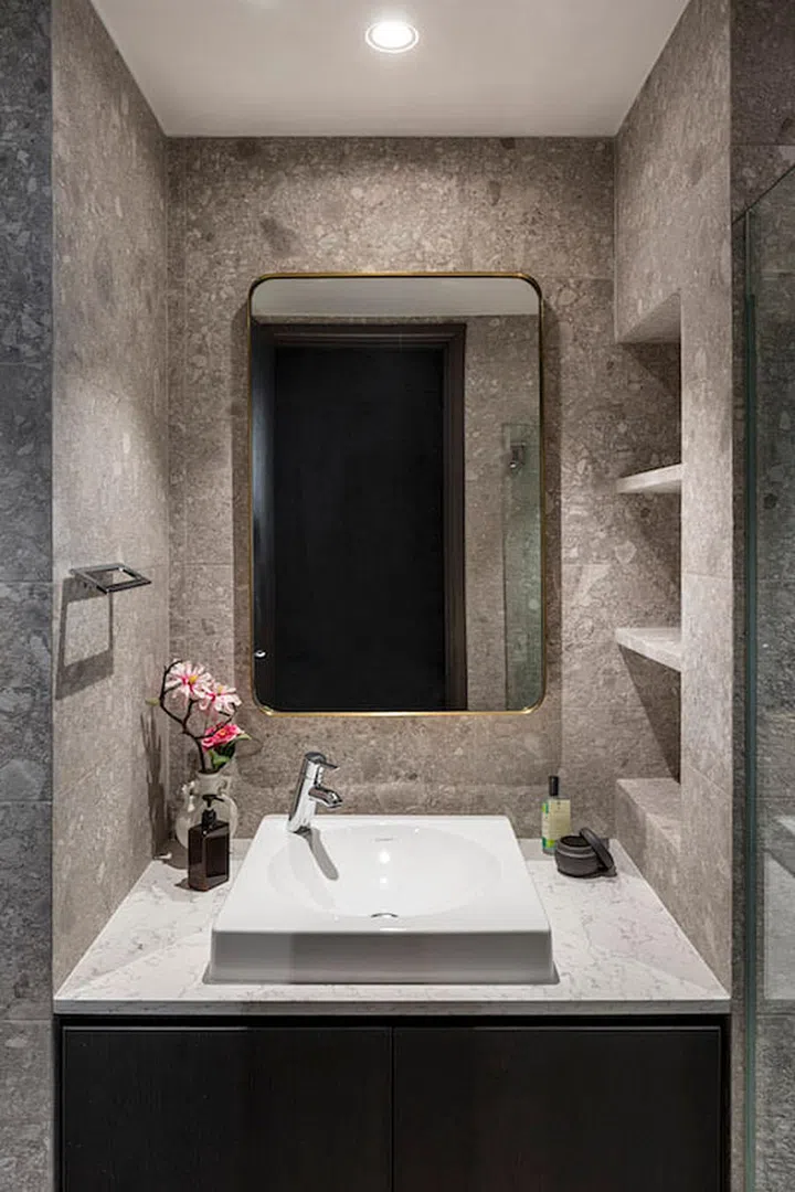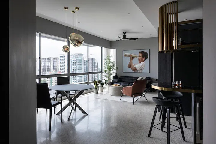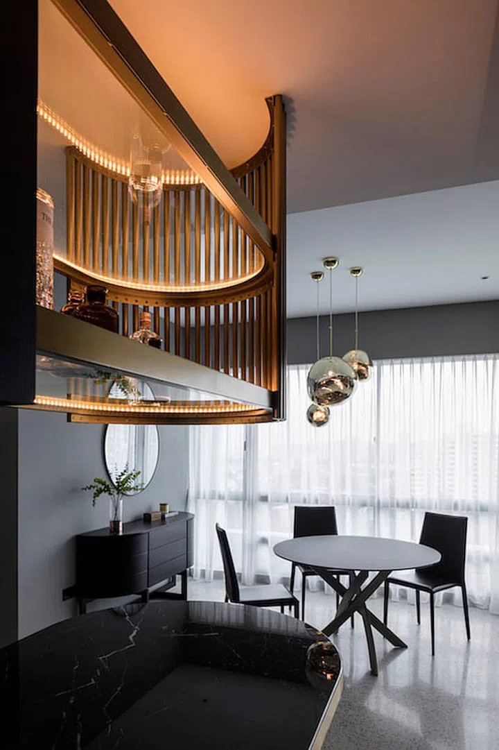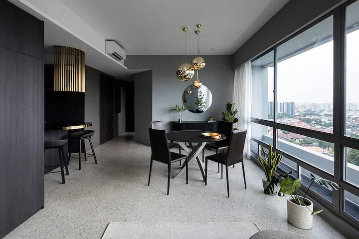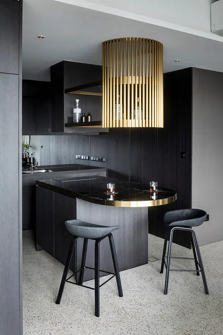 Instead of a dark colour scheme typical of most bachelor pads, Zhong Yi and Elisabeth chose a balanced palette of black, white and gold for the home. The terrazzo flooring, too, is in sync with the palette, given its black, grey and gold chips.
