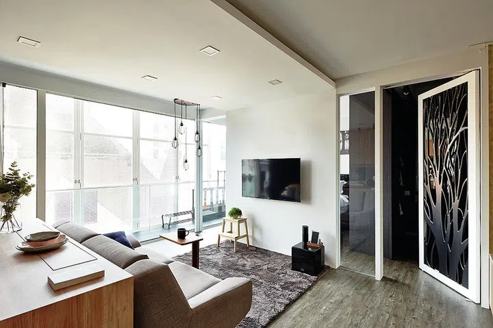 The partition between the living and bedroom space is made partly of glass, and a see-through wooden screen to lighten its look.