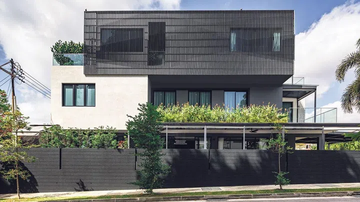 Seen from outside, it is easy to see why the home is nicknamed The Black Box House. The black box floating above the house is built from a series of fins on the attic that provide sun shading and privacy, while adding flair to the external façade.