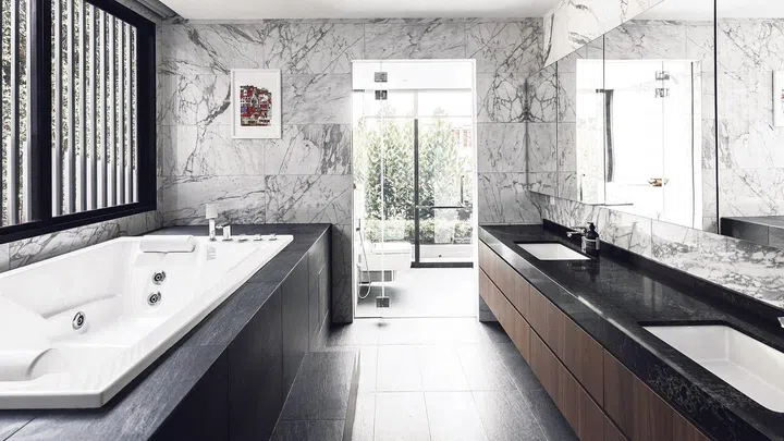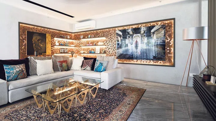 Wanting the living room to make a visual impact on visitors, the recessed section of the room wall was lined with copper-plated mosaic tiles, and adorned with large art works. The couple turned their house into a smart home, so everything from the blinds, entertainment systems and security can be controlled from their phones.