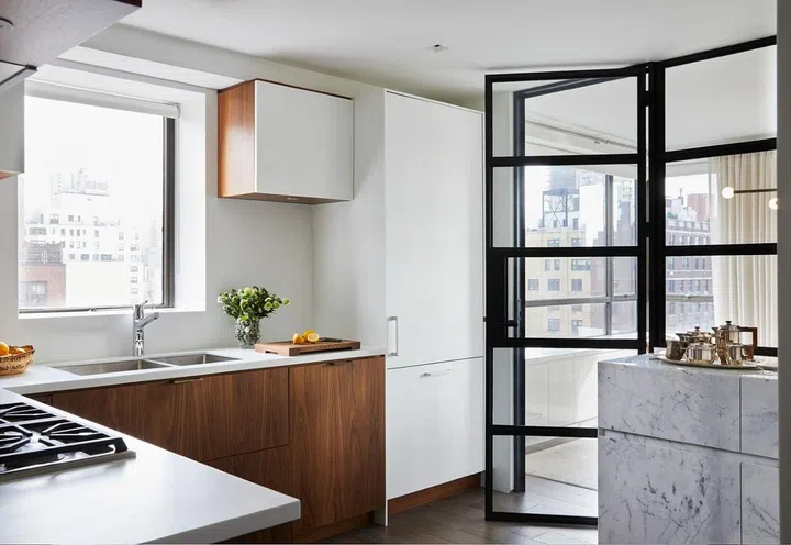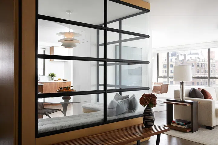 In place of walls, glass panels establish a relationship between the living space and kitchen. It alludes to the apartment's modern and roomier feel, while allowing natural light to reach both the kitchen and the entryway.