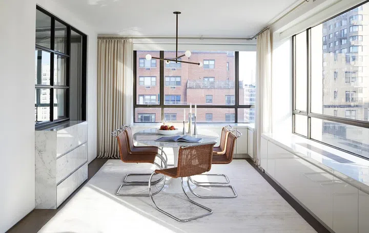 A pied-a-terre (a weekend or vacation home) for a couple who lives in Australia and whose daughter resides here, this 1,400 sq ft apartment in New York conceptualised by Pembrooke & Ives takes its design cues from the couple's love of classic modern elements as well as inspiration from French interior designer Jean Michel Frank and the Bauhaus movement.