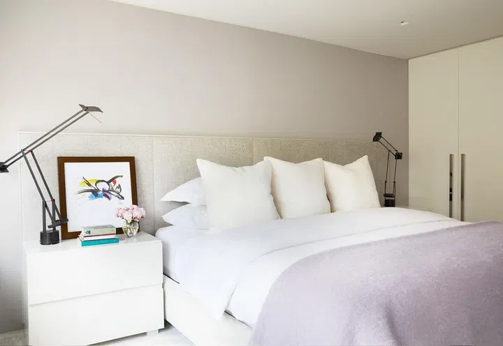 Inside the only bedroom of the abode, the modern classic aesthetic continues. A soft wash of colour, light silvery grey with white accents - envelopes the space.