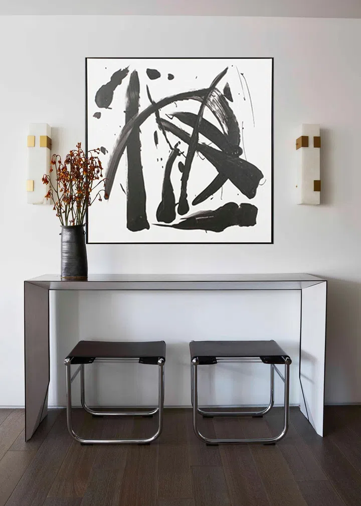 A striking abstract art piece draws the eye and creates visual impact while tying in with the overall elegant, classic ambience.