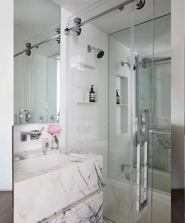 The bathroom is outfitted with white Glassos crystallised glass, custom white Corian solid surface shower walls and Dornbracht fittings. The result is a sleek space that can easily be cleaned and maintained.