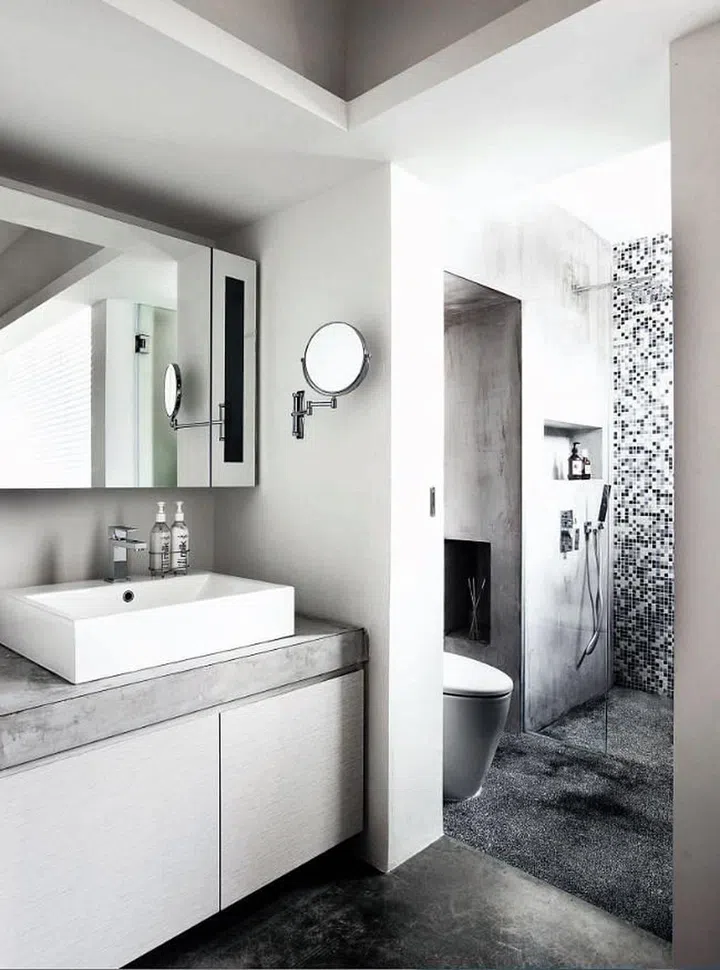 The piping clutter was boxed up, resulting in a WC cubicle and storage niches that transform technical necessities into architectural features. This approach to bathroom renovation—finding design opportunities within HDB constraints rather than merely concealing them—elevates the compact space beyond typical Singapore bathroom renovations.