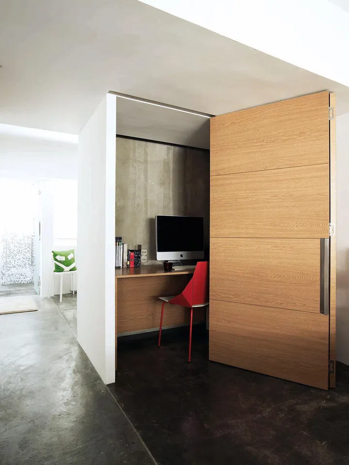 This thoughtful integration of work and rest areas acknowledges contemporary living patterns while maintaining clear boundaries between different modes of domestic life. The sliding mechanism allows the homeowner to physically close off his work environment, creating psychological separation that supports work-life balance despite the apartment’s limited square footage.