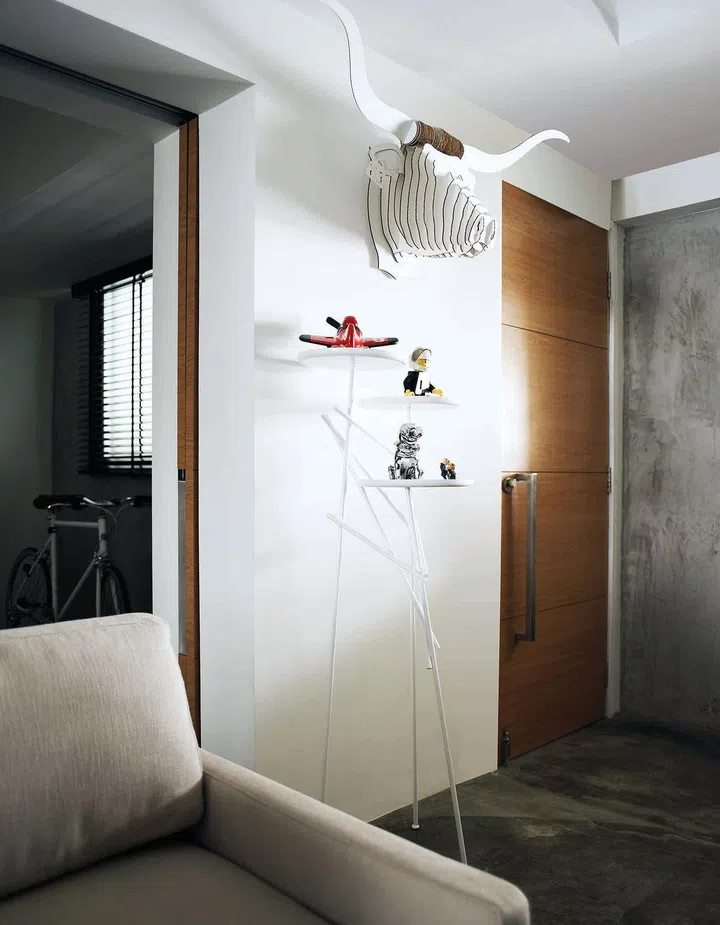 A cardboard trophy head adds a touch of humor to the otherwise serene environment, demonstrating that minimalist bachelor pad design needn’t be sterile or lacking personality.