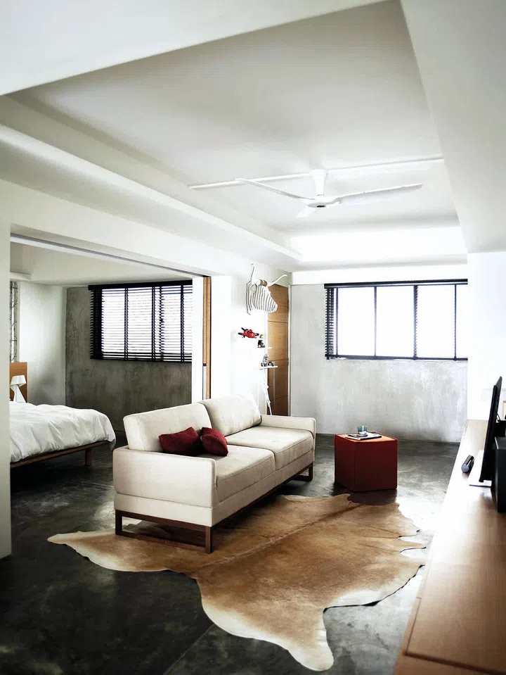 The main living room wall is rendered in raw concrete to replicate the texture of off-form concrete—a construction method where concrete is cast against formwork, such as a woodgrain panel, causing the concrete to take on a woodgrain texture.
