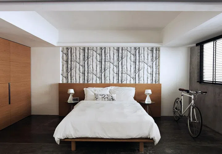 The study area, which sits to the left of the bed, occupies a mere 90cm deep space and can be closed off with sliding hinged panels when not in use—a smart solution for small HDB apartments where multifunctional spaces are essential.