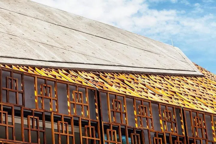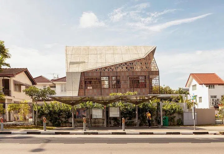 The intricately-cut teak screens act as a veil around the façade of the home, blocking out the sun while still letting in enough natural light.