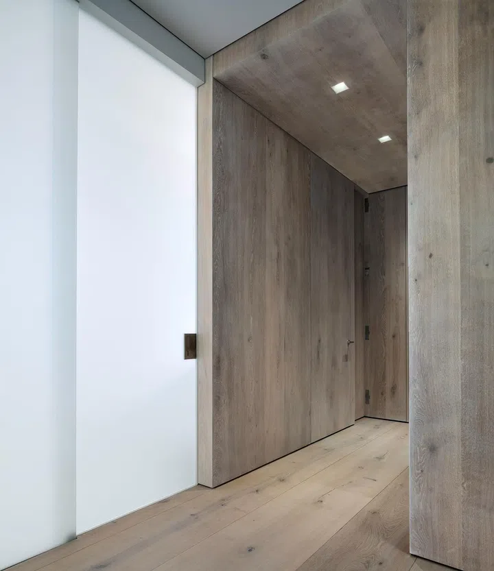 Architect Michael Gabellini is listed as a co-designer. Richly-coloured Danish oak, with intricate grains, line the door and walls in the entrance. The same luxurious material is used for the flooring of the interiors.