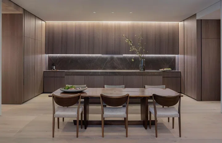 There is a sense of open-ness as soon as one steps into the abode, thanks to the 2.7 metre-high ceiling. Dark wood panelling sets the tone in the dining area.